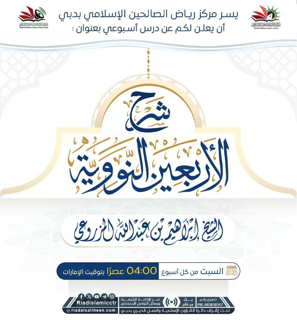 يسر مركز رياض الصالحين الإسلامي بدبي أن يعلن لكم عن درس أسبوعي (عن بعد) بعنوان: