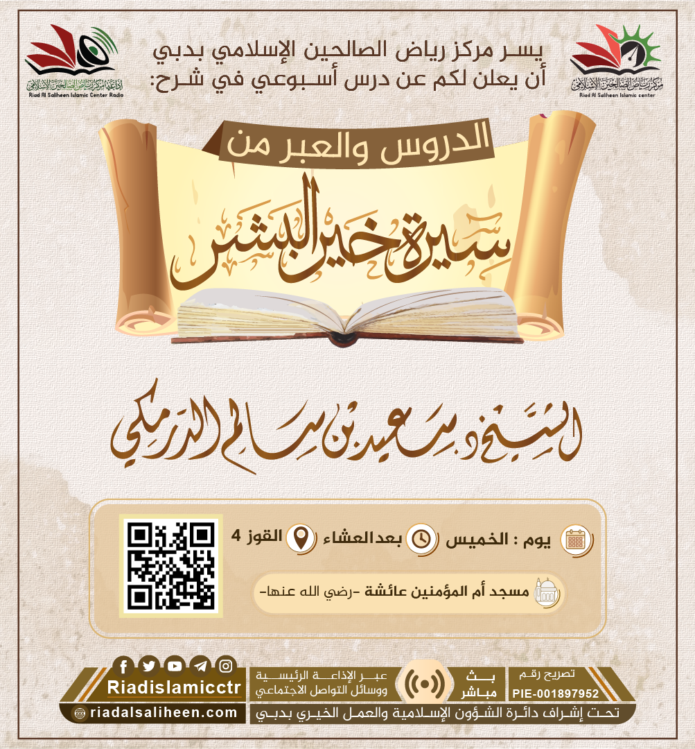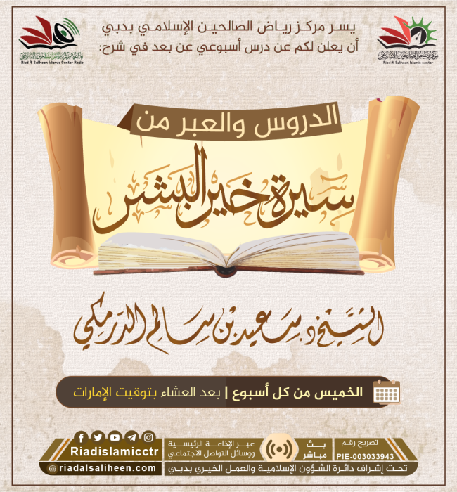 يسر مركز رياض الصالحين الإسلامي بدبي أن يعلن لكم عن درس أسبوعي “عن بعد” بعنوان:
