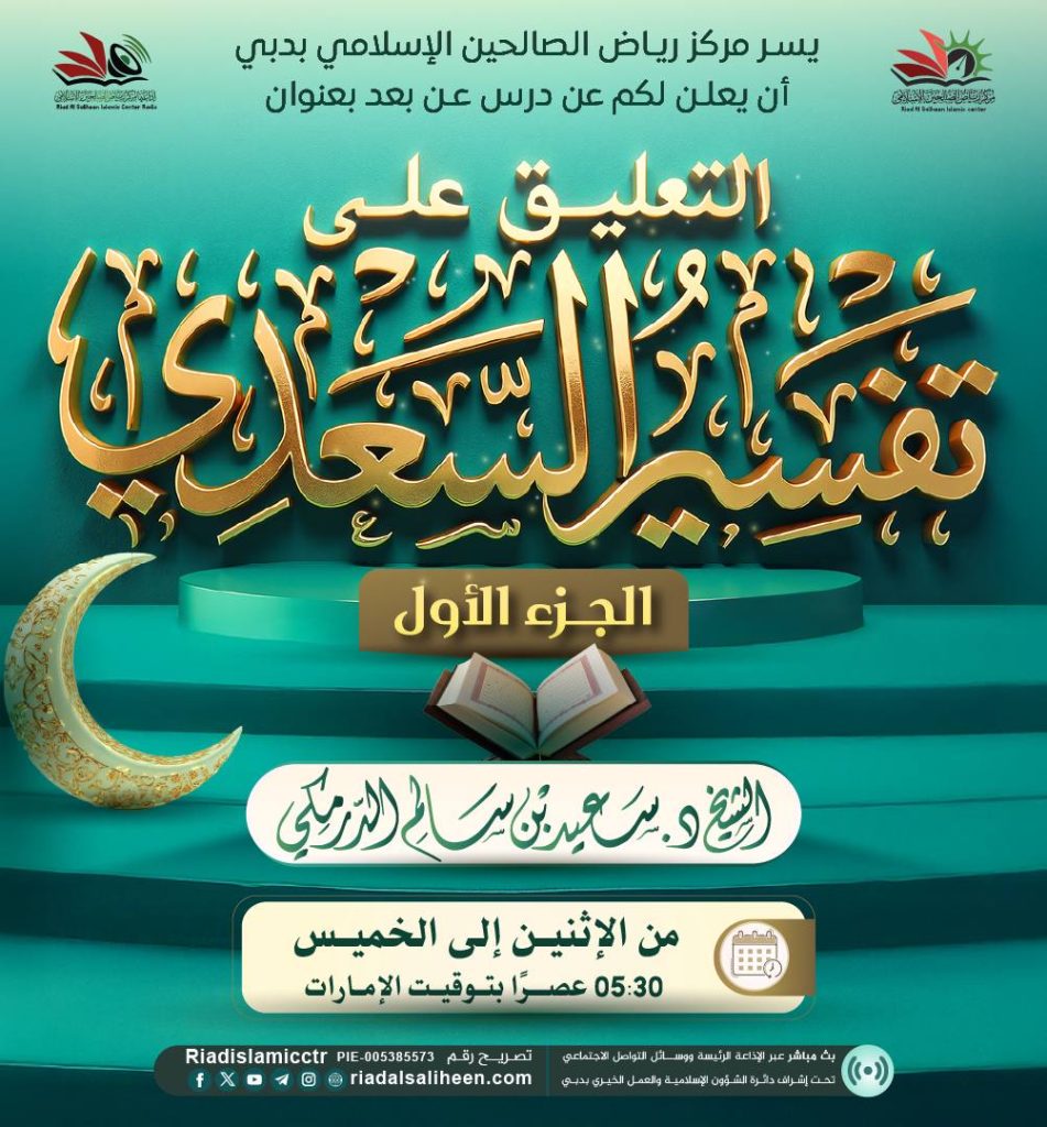يسر مركز رياض الصالحين الإسلامي بدبي أن يعلن لكم عن درس يومي (عن بعد) بعنوان: