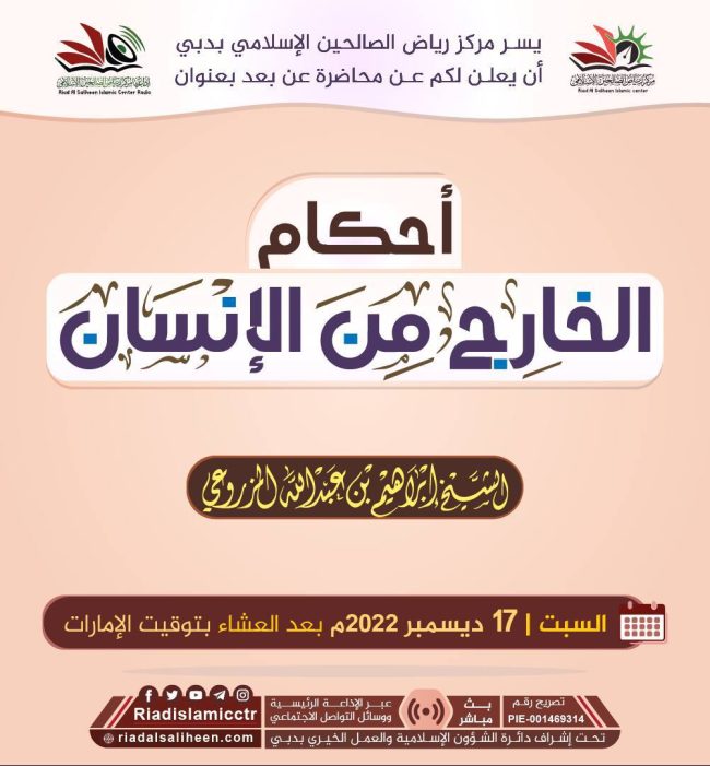 يسر مركز رياض الصالحين الإسلامي بدبي أن يدعوكم للاستماع للبث المباشر “عن بعد” لمحاضرة بعنوان:
