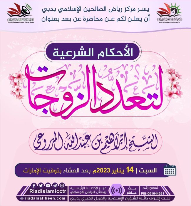 يسر مركز رياض الصالحين الإسلامي بدبي أن يدعوكم للاستماع للبث المباشر “عن بعد” لمحاضرة بعنوان: