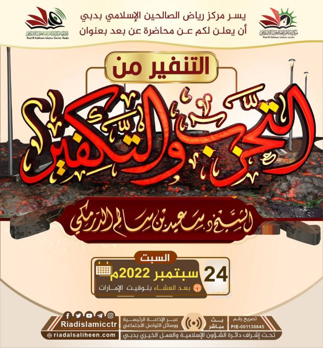 يسر مركز رياض الصالحين الإسلامي بدبي أن يدعوكم للاستماع للبث المباشر “عن بعد” لمحاضرة بعنوان: