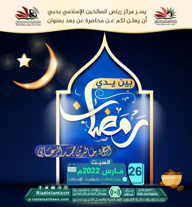يسر مركز رياض الصالحين الإسلامي بدبي أن يدعوكم للاستماع للبث المباشر “عن بعد” لمحاضرة بعنوان:
