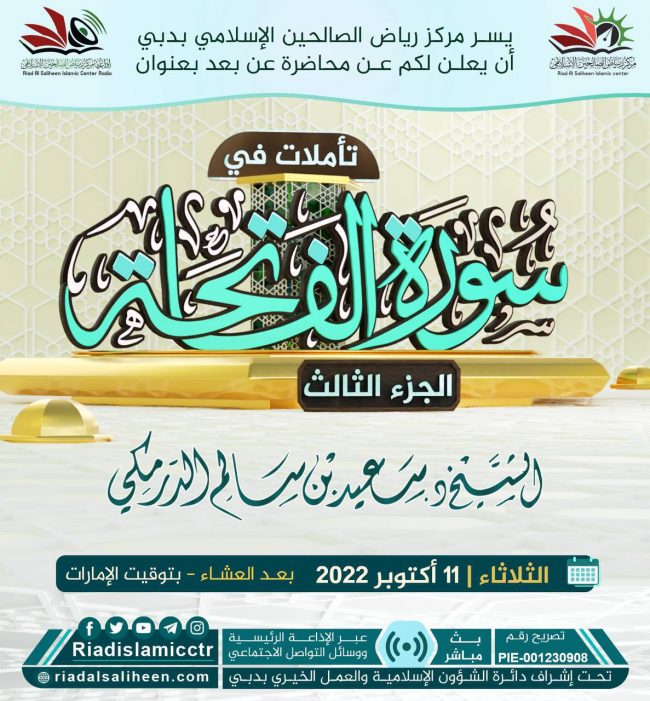 يسر مركز رياض الصالحين الإسلامي بدبي أن يدعوكم للاستماع للبث المباشر “عن بعد” لمحاضرة بعنوان:
