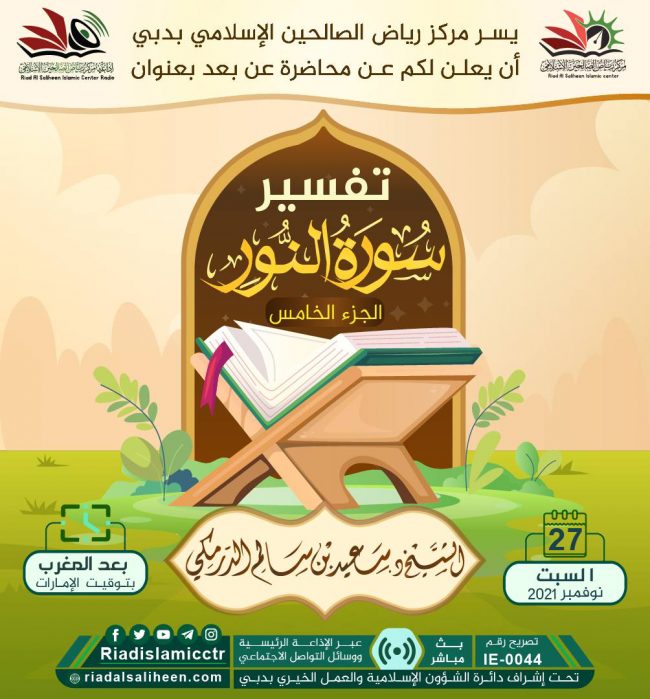 محاضرة عن بعد بعنوان: (تفسير سورة النور | الجزء الخامس)