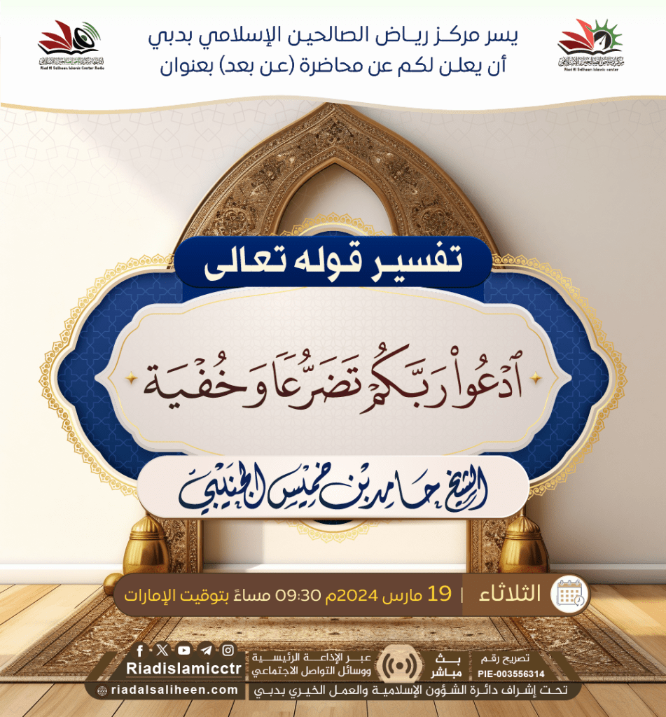 يسر مركز رياض الصالحين الإسلامي بدبي أن يدعوكم للاستماع للبث المباشر “عن بعد” لمحاضرة بعنوان:
