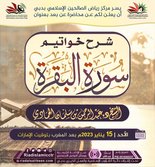 يسر مركز رياض الصالحين الإسلامي بدبي أن يدعوكم للاستماع للبث المباشر “عن بعد” لمحاضرة بعنوان: