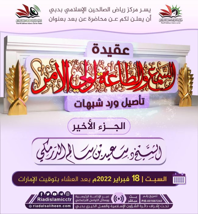 يسر مركز رياض الصالحين الإسلامي بدبي أن يدعوكم للاستماع للبث المباشر “عن بعد” لمحاضرة بعنوان: