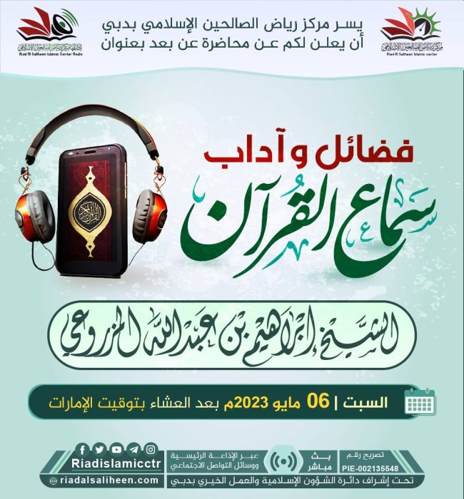 يسر مركز رياض الصالحين الإسلامي بدبي أن يدعوكم للاستماع للبث المباشر “عن بعد” لمحاضرة بعنوان: