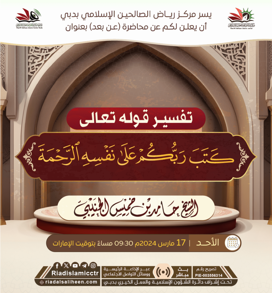 يسر مركز رياض الصالحين الإسلامي بدبي أن يدعوكم للاستماع للبث المباشر “عن بعد” لمحاضرة بعنوان: