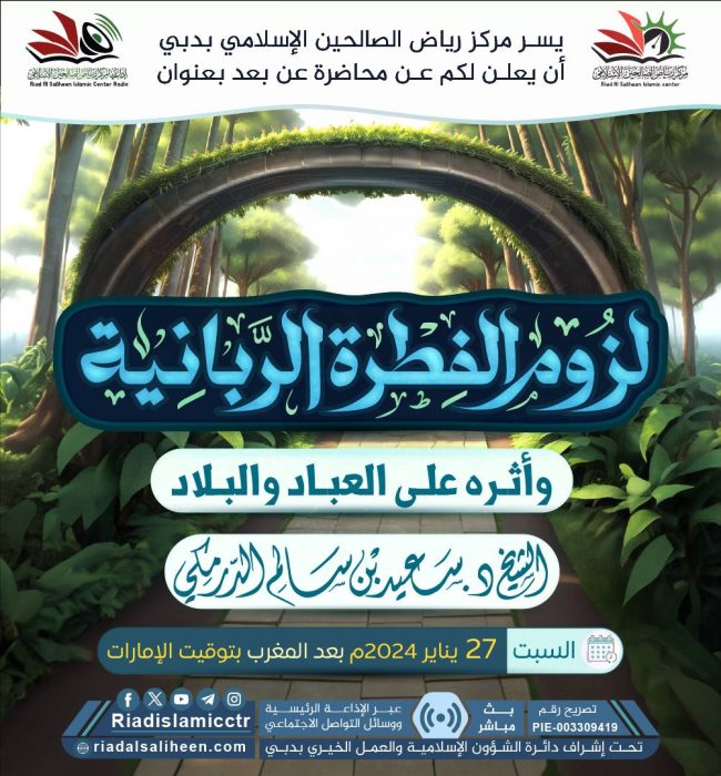 يسر مركز رياض الصالحين الإسلامي بدبي أن يدعوكم للاستماع للبث المباشر “عن بعد” لمحاضرة بعنوان: