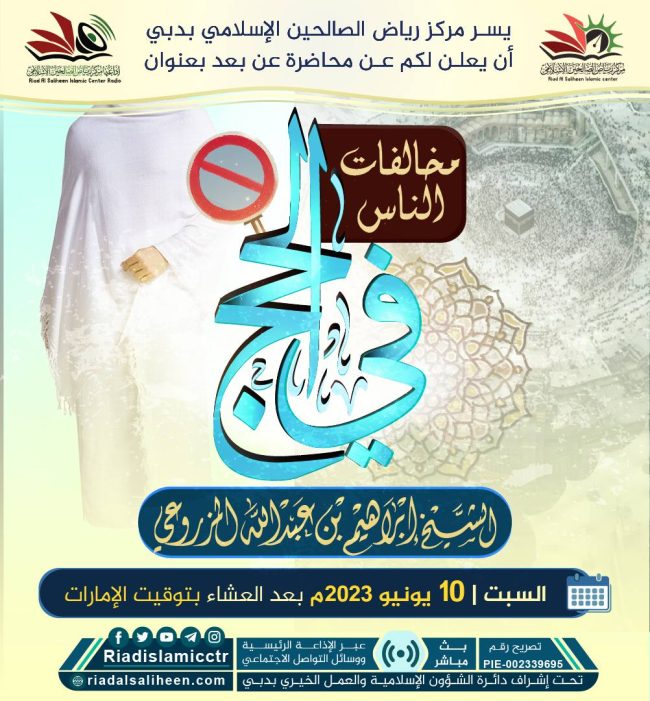 يسر مركز رياض الصالحين الإسلامي بدبي أن يدعوكم للاستماع للبث المباشر “عن بعد” لمحاضرة بعنوان: