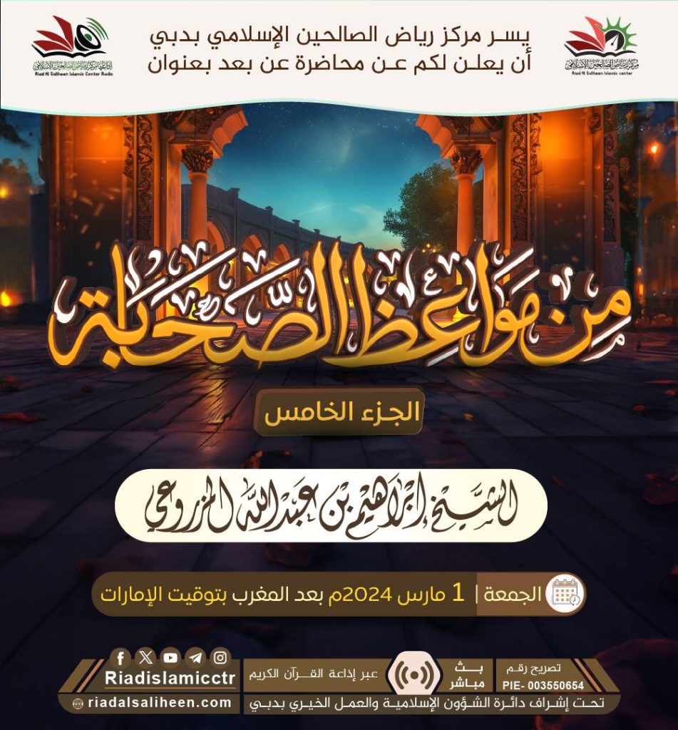 يسر مركز رياض الصالحين الإسلامي بدبي أن يدعوكم للاستماع للبث المباشر “عن بعد” لمحاضرة بعنوان: