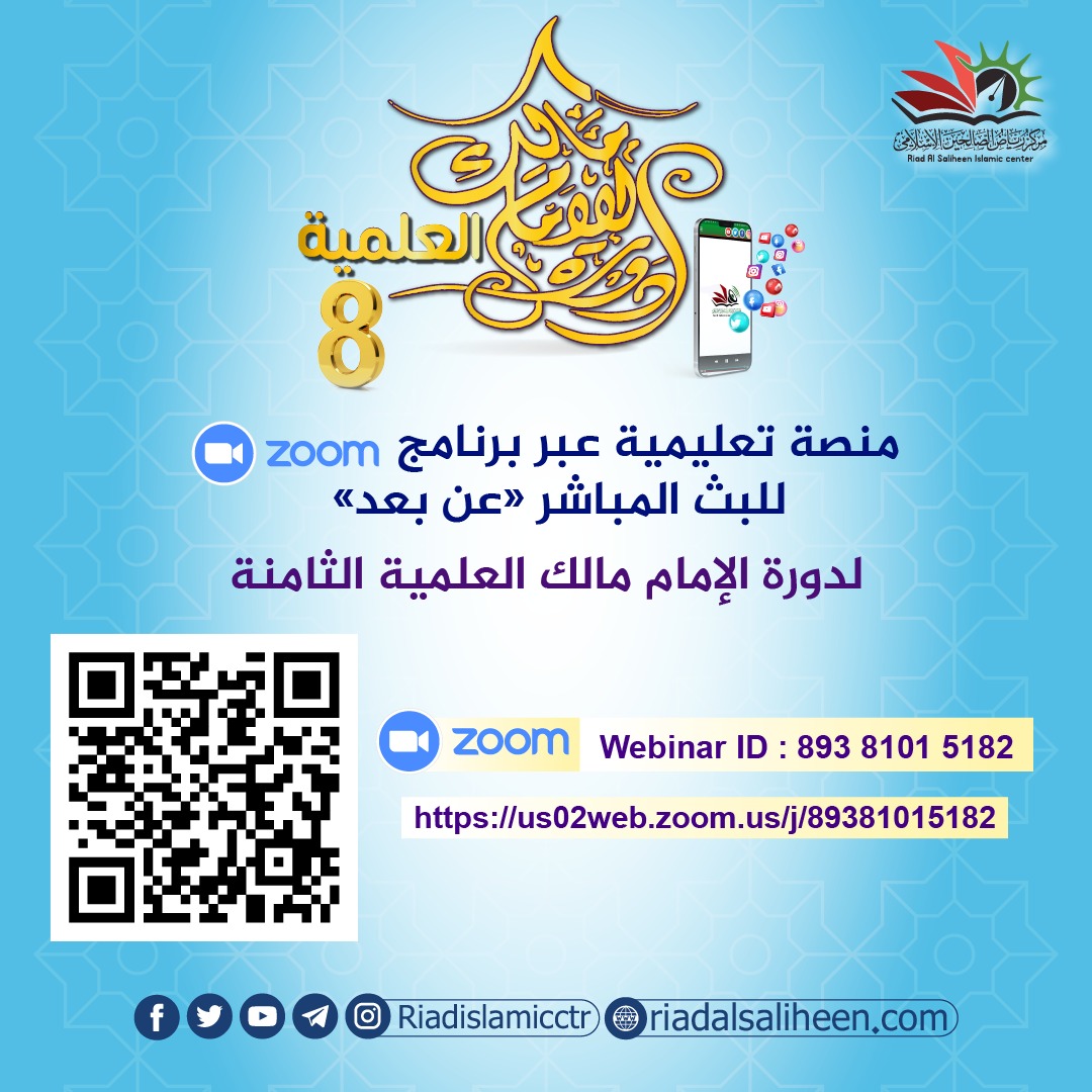#تابعونا منصة تعليمية عبر برنامج zoom للبث المباشر “عن بعد” لدورة: الإمام مالك العلمية الثامنة رابط المنصة: https://us02web.zoom.us/j/89381015182 Webinar ID: 893 8101 5182