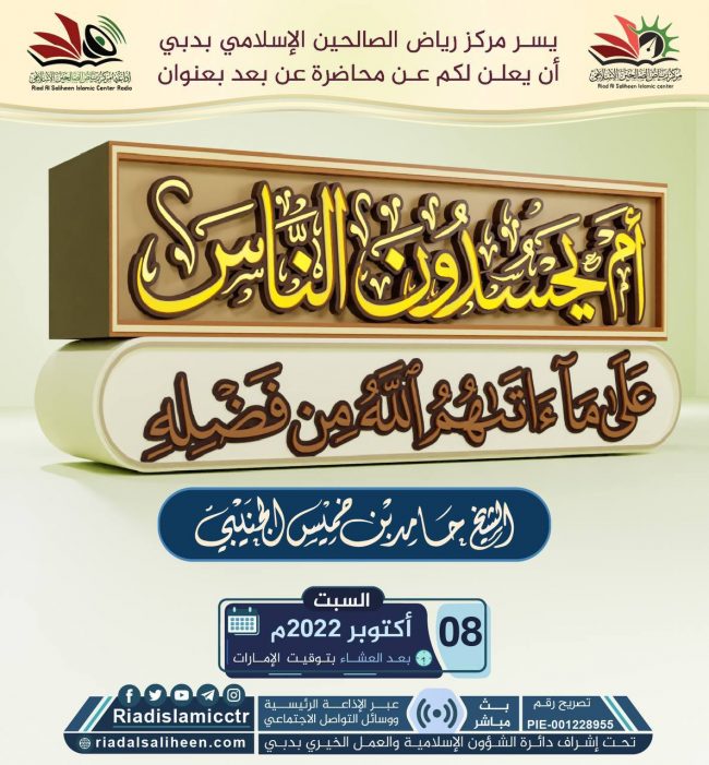 محاضرة عن بعد بعنوان: (أَمْ يَحْسُدُونَ النَّاسَ عَلَىٰ مَا آتَاهُمُ اللَّهُ مِن فَضْلِهِ)