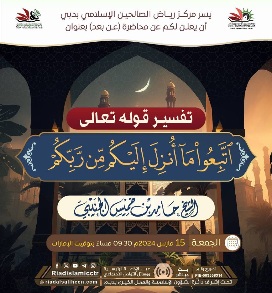 يسر مركز رياض الصالحين الإسلامي بدبي أن يدعوكم للاستماع للبث المباشر “عن بعد” لمحاضرة بعنوان: