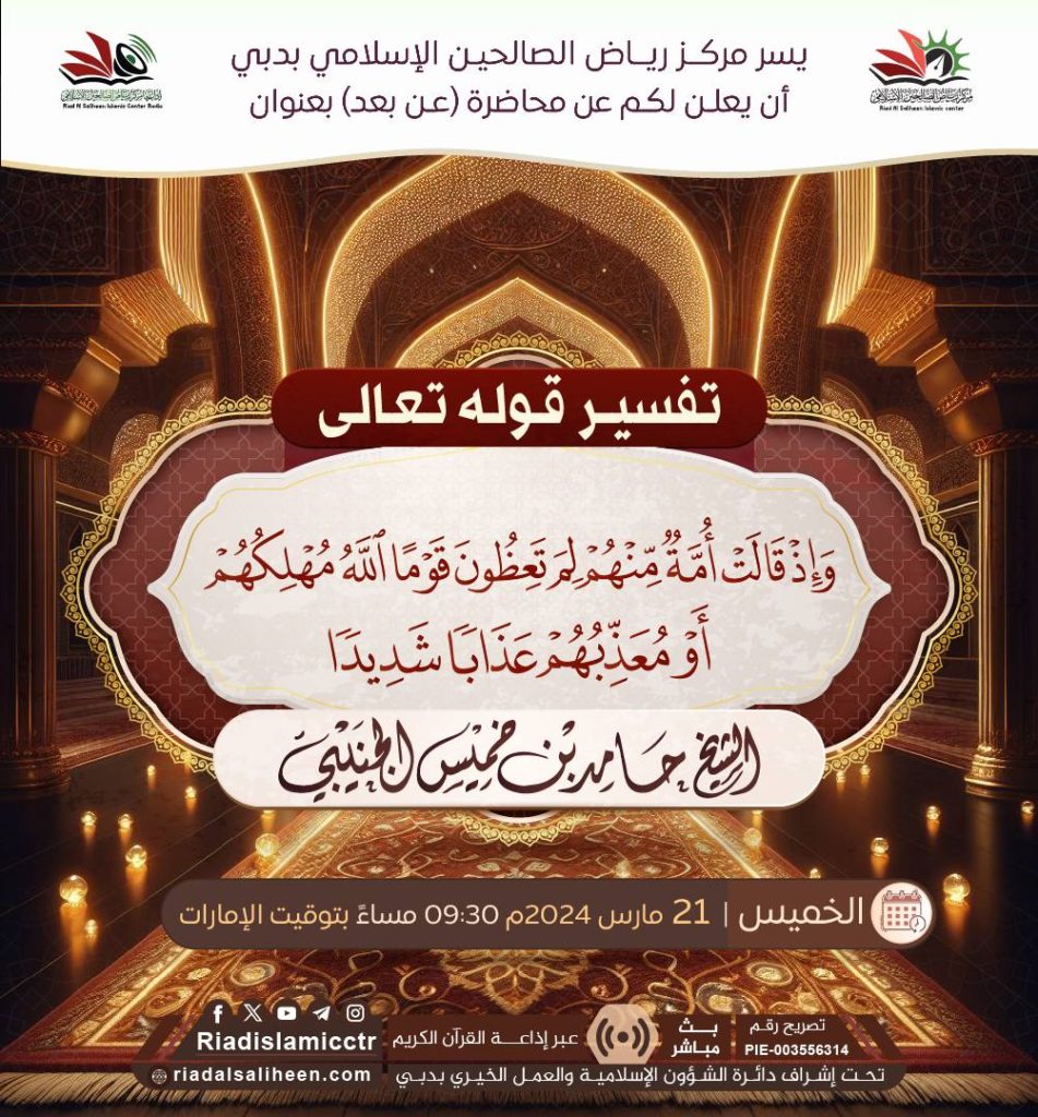 يسر مركز رياض الصالحين الإسلامي بدبي أن يدعوكم للاستماع للبث المباشر “عن بعد” لمحاضرة بعنوان:
