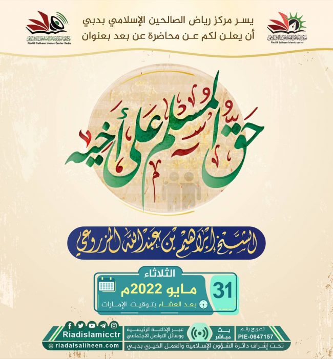 يسر مركز رياض الصالحين الإسلامي بدبي أن يدعوكم للاستماع للبث المباشر “عن بعد” لمحاضرة بعنوان:
