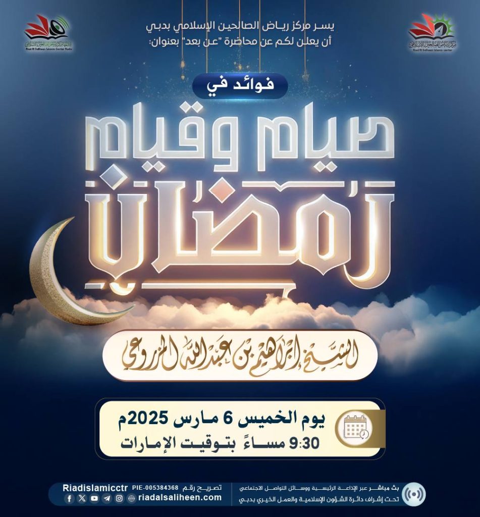يسر مركز رياض الصالحين الإسلامي بدبي أن يعلن لكم عن محاضرة “عن بعد” بعنوان: