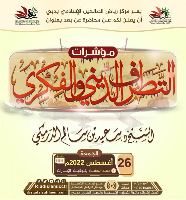 يسر مركز رياض الصالحين الإسلامي بدبي أن يدعوكم للاستماع للبث المباشر “عن بعد” لمحاضرة بعنوان: