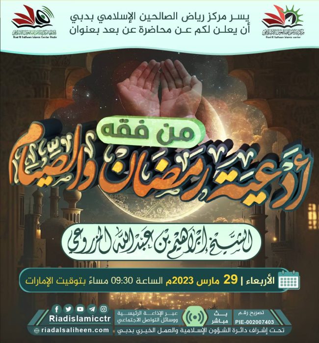 يسر مركز رياض الصالحين الإسلامي بدبي أن يدعوكم للاستماع للبث المباشر “عن بعد” لمحاضرة بعنوان: