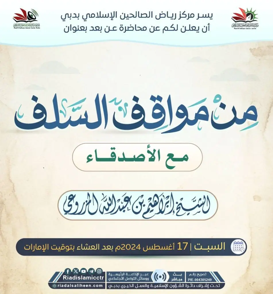 يسر مركز رياض الصالحين الإسلامي بدبي أن يدعوكم للاستماع للبث المباشر “عن بعد” لمحاضرة بعنوان: